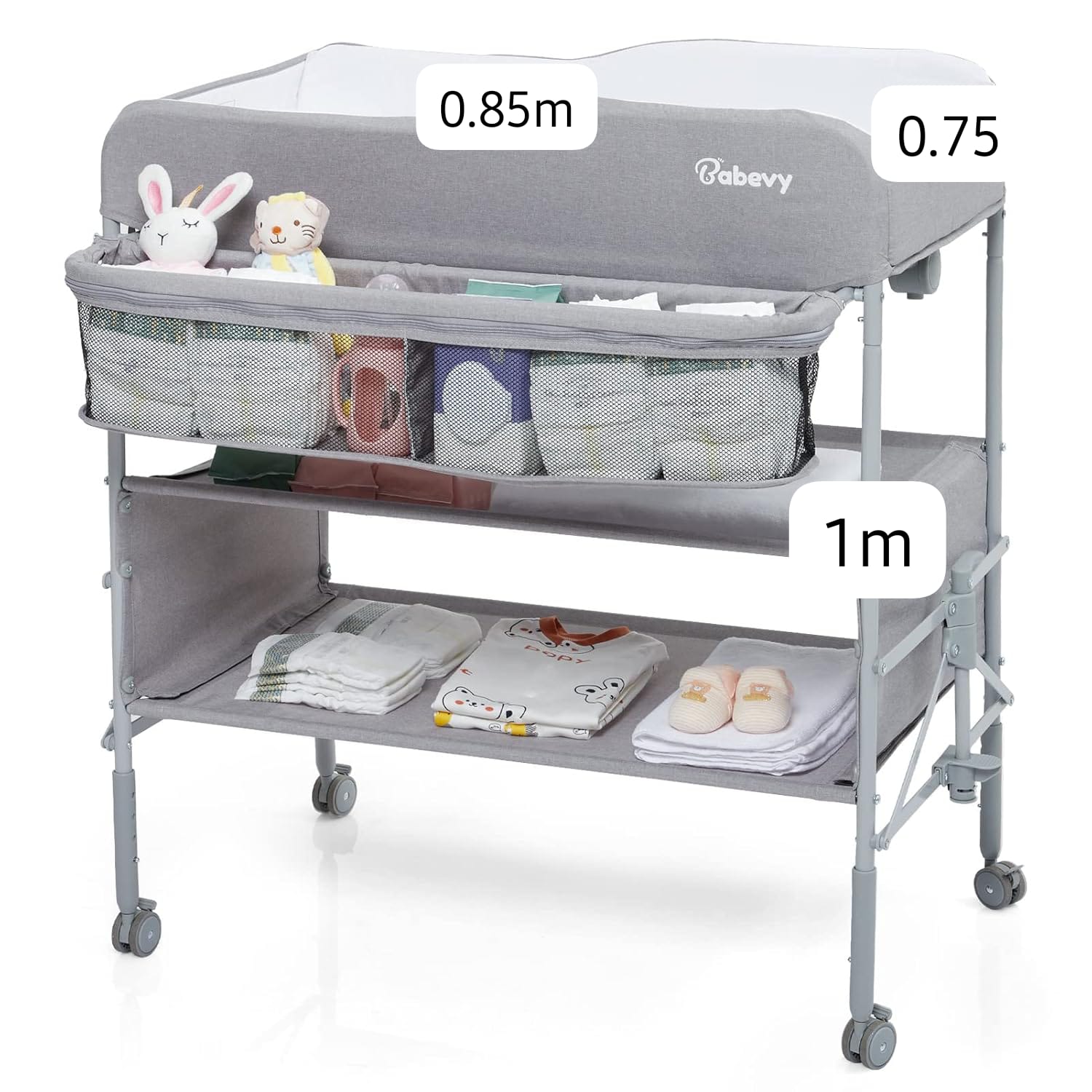 Su diseño plegable facilita el guardado cuando no está en uso, y la bandeja inferior permite tener pañales, toallitas y accesorios siempre a mano.